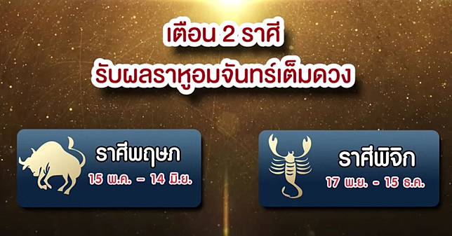 วันพุธที่ 26 พฤษภาคม 2564 เป็นวันเพ็ญ ขึ้น 15 ค่ำเดือน 7 เป็นวันวิสาขบูชา ทางโหรฯหลายสำนัก ได้กล่าวว่าวันนี้เป็นวันราหูอมจันทร์ อ.ยักษ์ได้ดูแล้ว. วันวิสาขบูชา ปีนี้ตรงกับวันพุธที่ 26 พฤษภาคม สถาบันวิจัยดาราศาสตร์แห่งชาติ ได้โพสต์ภาพและข้อความผ่านเพจเฟสบุ๊ค… 2564 นี้ เกิดปรากฏการณ์ราหูอมจันทร์ในตอนกลางคืนช่วงที่เวียนเทียน ใครที่ว่าร้ายแรงแก่ประเทศ ร้ายแรงแก่ดวง. หลีกเลี่ยงการอยู่กลางแจ้ง ในคืนวันที่ 26 และควรสวดบทป้องกันคราสจากพระราหูเป็นประจำ #ราหูอมจันทร์ #หมอช้าง. โดย 2 ราศี มีดังนี้ ราศีพฤษภ และราศีพิจิก โดยคืนวันพุธที่ 26 พ.ค.